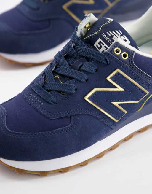 New Balance 574 Sneakers in marineblauw met gouden biezen ASOS