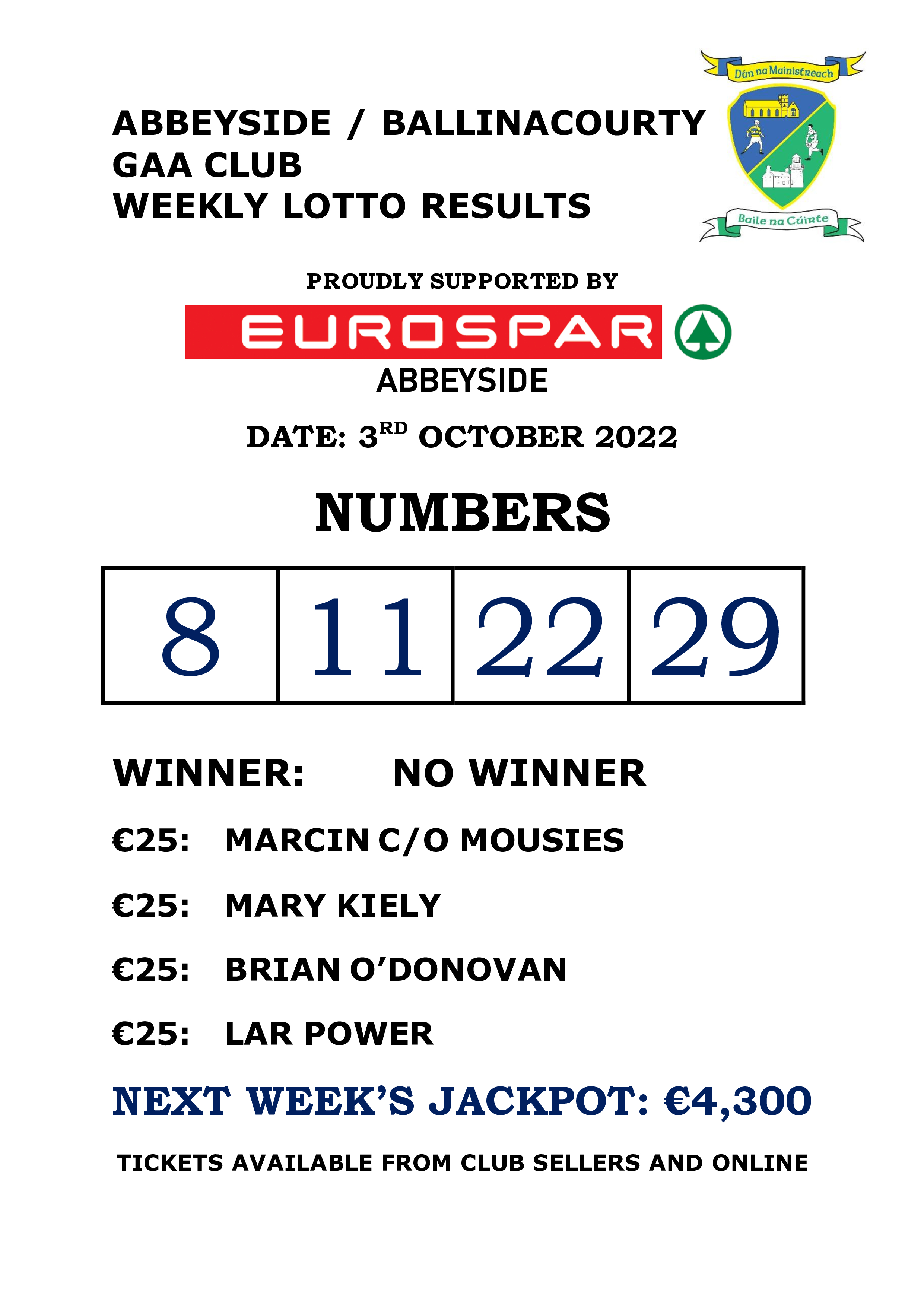 Lotto Results for Sunday October 8 2023 Walterstown GFC