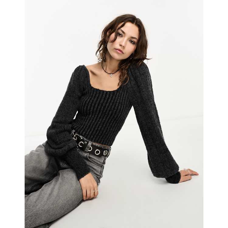 Free People soft puff sleeve square neck sweater in charcoal gray