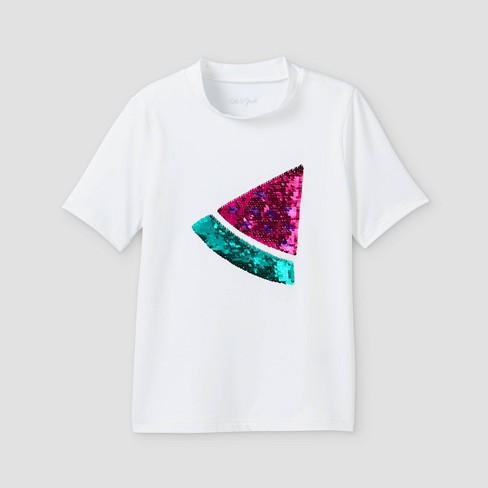 Girls Watermelon Flip Sequin Short Sleeve Rash Guard Swim Shirt