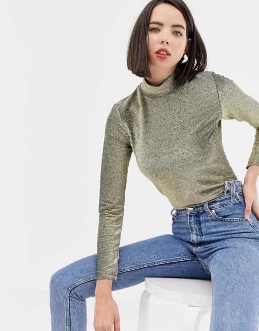 Glitter shop polo neck, Warehouse roll neck top in gold sparkle shop