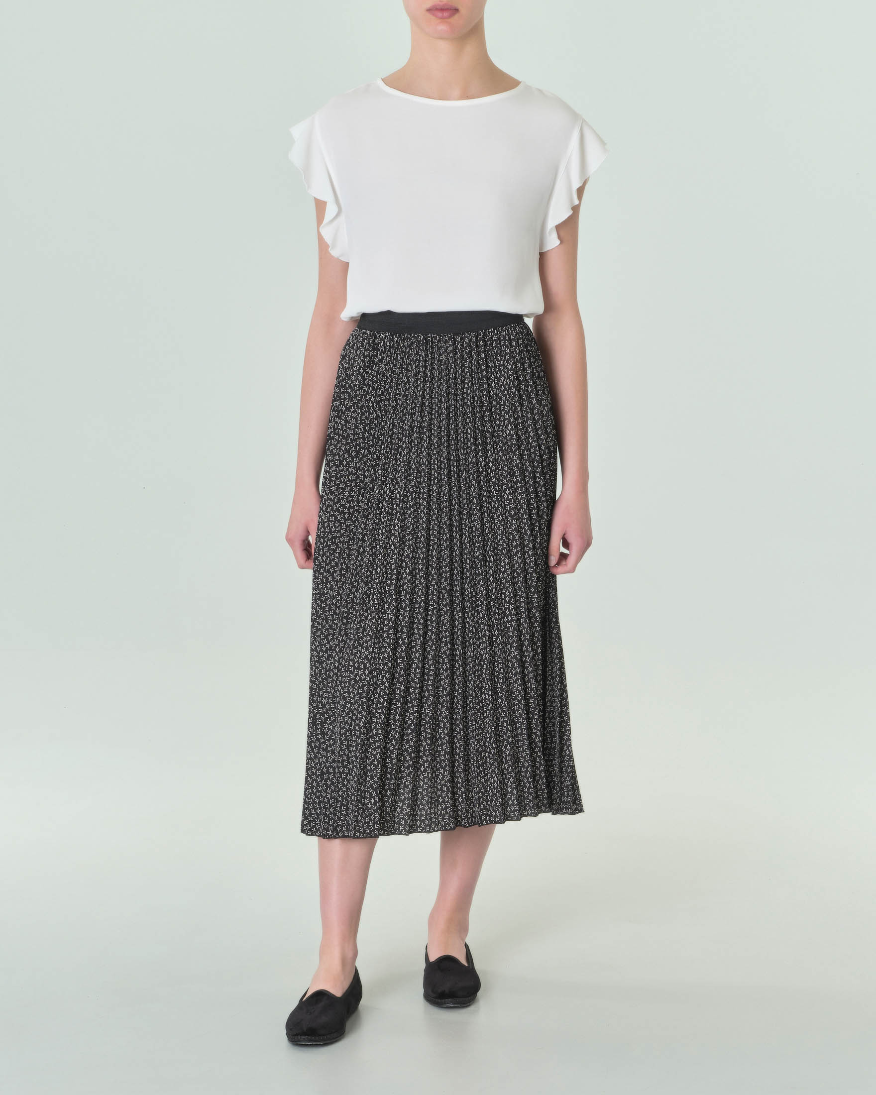Gonna midi nera a pieghe in tessuto a fantasia botanica bianca