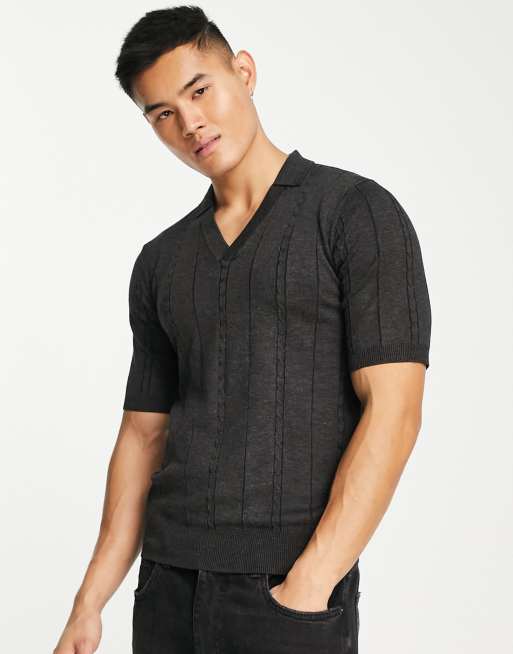 Gianni Feraud cable knit short sleeve polo jumper in dark grey