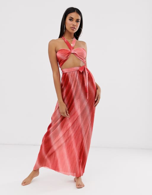 Halter neck maxi beach shop dress, ASOS DESIGN halter neck beach maxi dress with cut out waist in ombre metallic jersey plisse shop