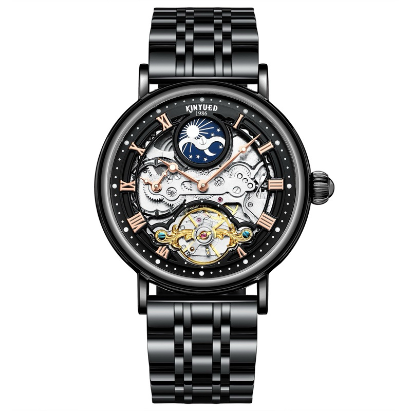 kinyued Mens Dual Time Automatic Mechanical Watch Rose Gold Black Dial Black Leather