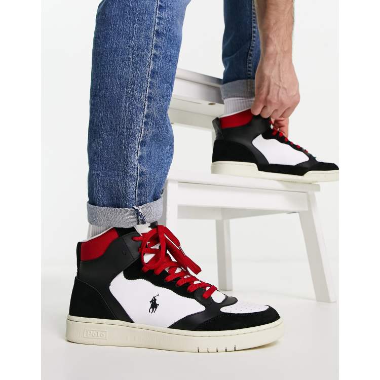 Polo Ralph Lauren hi top court lux trainer in black red with pony logo