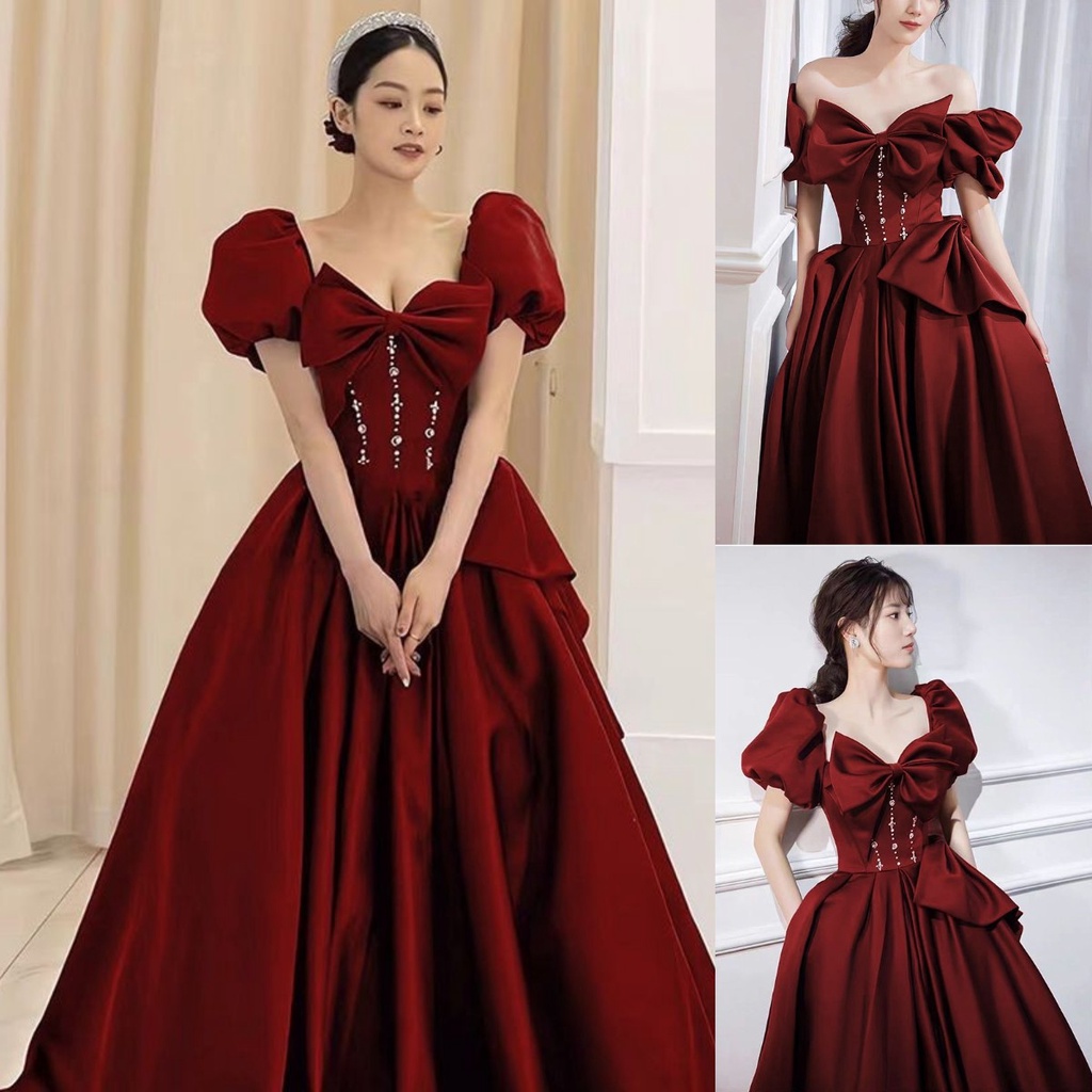 Red shop evening dress, Wine Red Evening Dress Bride French Party Dress Wedding Engagement shop