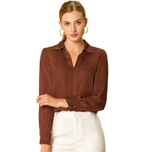 Allegra K Women s Elegant V Neck Long Sleeve Office Work Satin Blouse Brown Large