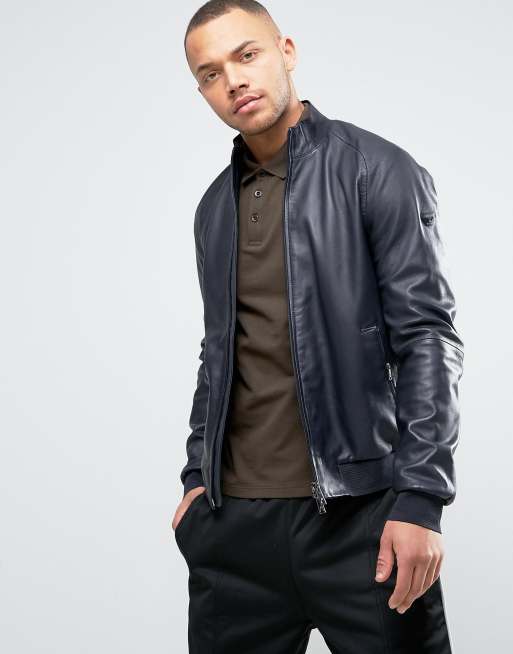 Armani Jeans Leather Bomber Jacket in Navy ASOS