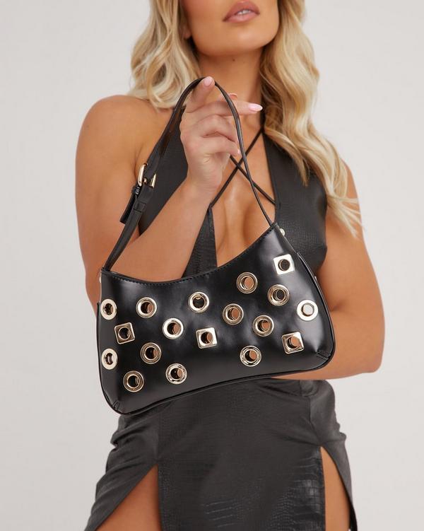 Baila Eyelet Detail Shaped Shoulder Bag In Black Faux Leather EGO