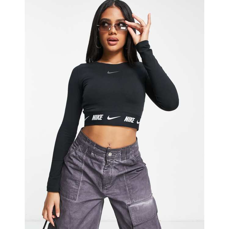 Nike Crop top a maniche lunghe nero con fettuccia con logo ASOS