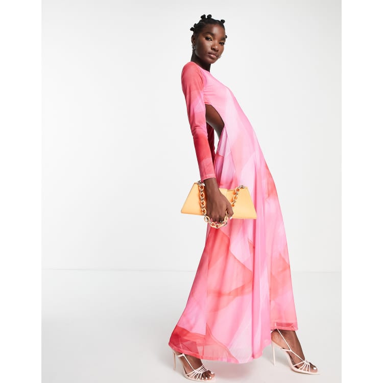 Topshop long sleeve maxi dress in pink and red watercolour mix ASOS