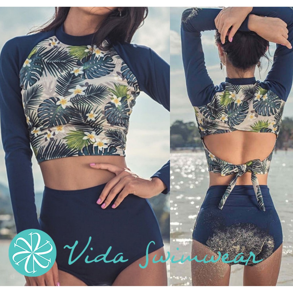 Two Pieces Women s Leaf Print Bikini Set Long Sleeve Rash Temu