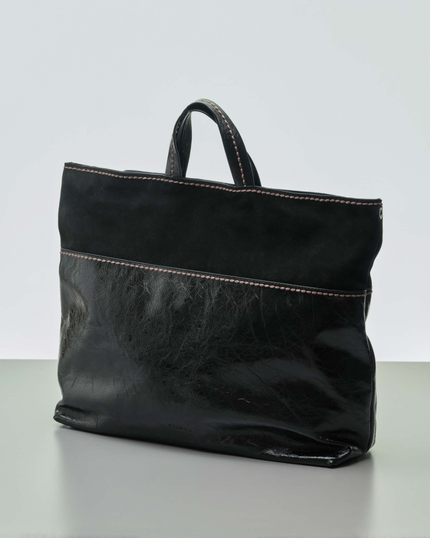 Borsa a mano grande nera in pelle effetto vernice e suede con
