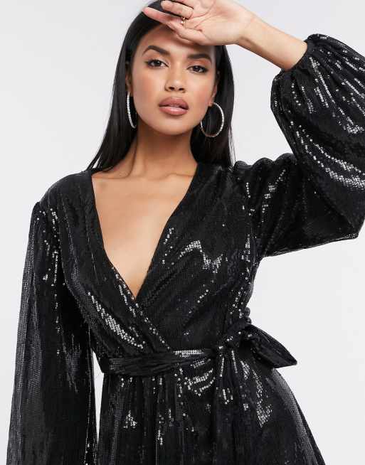 Missguided Vestito a portafoglio nero con paillettes e maniche a