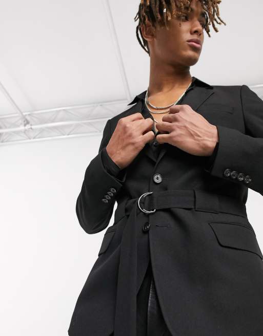 ASOS DESIGN slim belted suit jacket in black plisse ASOS