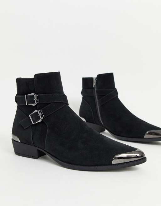 Asos design cuban heel western chelsea shop boots in black leather with buckle detail, ASOS DESIGN Wide Fit cuban heel western chelsea boots in black shop
