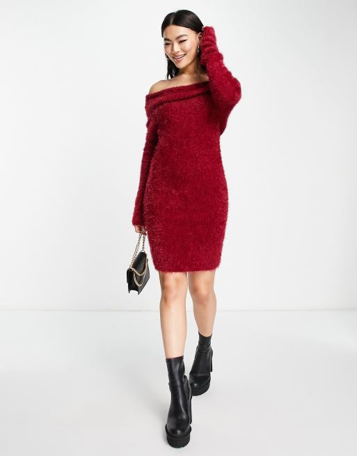 ASOS DESIGN off shoulder jumper dress in fluffy yarn in dark red