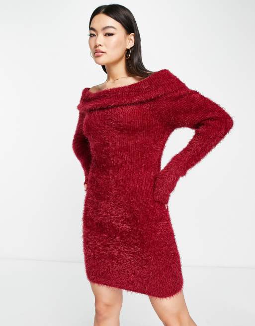 ASOS DESIGN off shoulder jumper dress in fluffy yarn in dark red