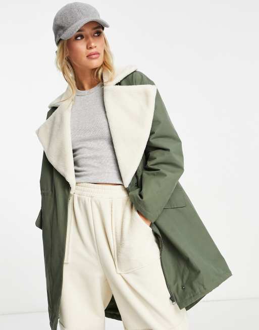 ASOS DESIGN quilt lined parka coat with borg collar in olive