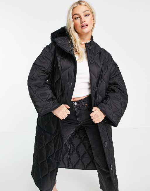 ASOS DESIGN Petite quilted longline hooded puffer jacket in black