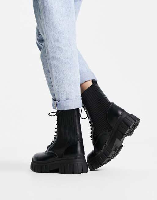 Pimkie chunky sole lace up biker boot with rib in black ASOS