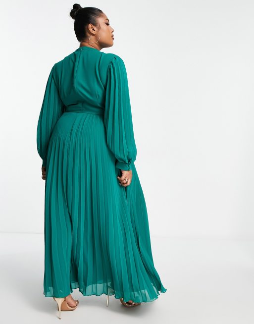 ASOS DESIGN Curve high neck pleated long sleeve skater maxi dress in dark green
