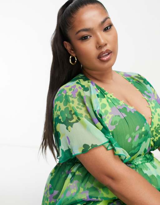 Asos plus size green shop dress, ASOS DESIGN Curve angel sleeve plunge tiered maxi dress with cut shop