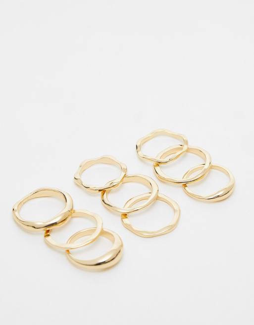 ASOS DESIGN pack of 9 rings with mixed molten design in gold tone