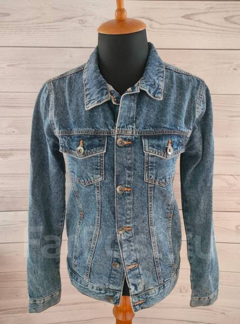 Jaket denim pull and shop bear, Pull Bear Denim Jacket In Vintage Wash With Flamingo Motif 46 shop