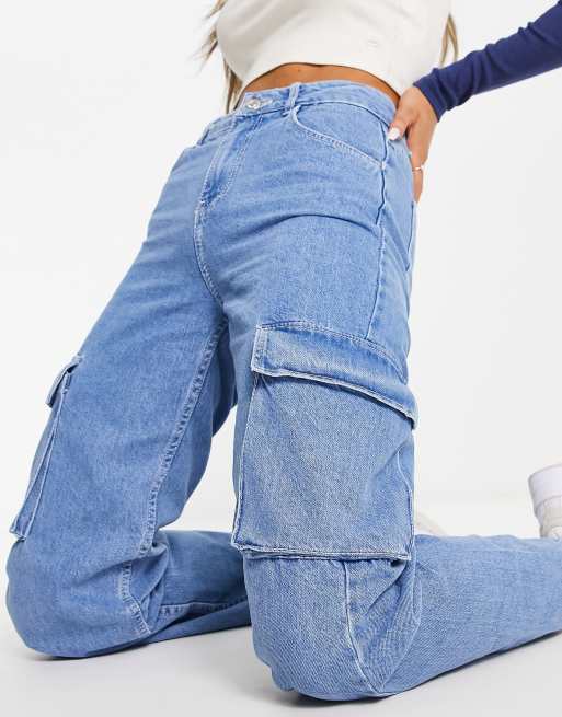 Bershka Pantaloni cargo in denim blu con cuciture a contrasto ASOS