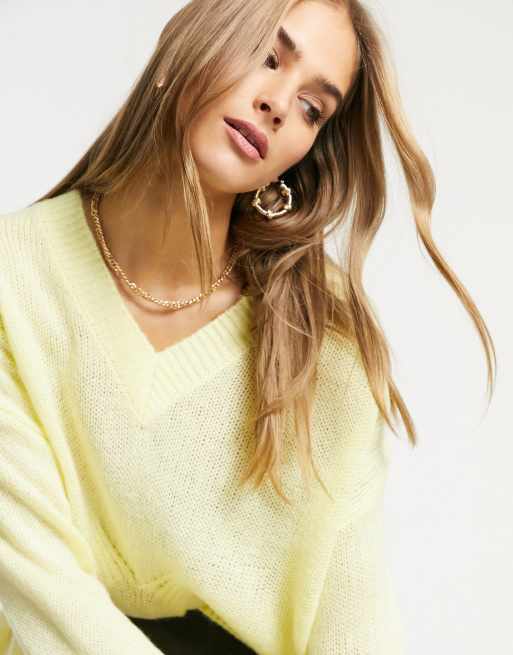Lost Ink slouchy relaxed jumper with v neck in lemon