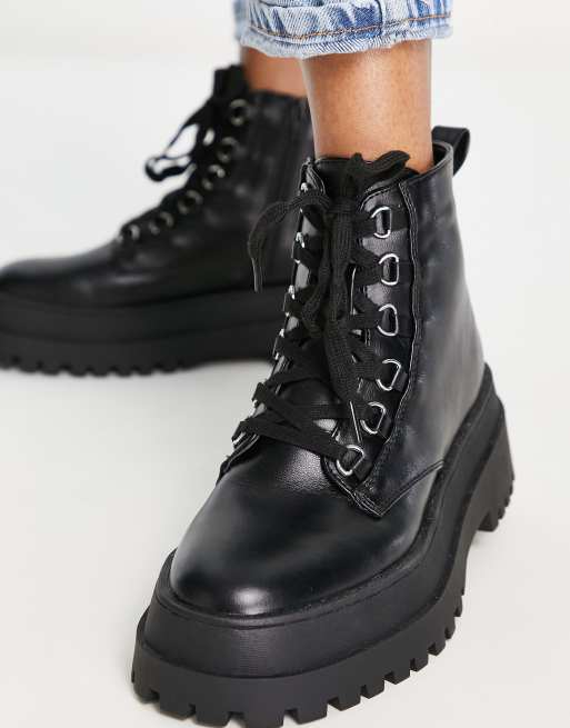 London Rebel Black Leather Look Lace Up Chunky Ankle Boots New Look
