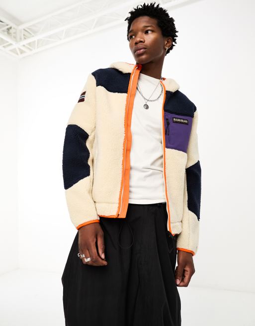 Napapijri yupik shop fleece jacket, Napapijri Yupik zip up hooded fleece jacket with logo patches in white and navy shop