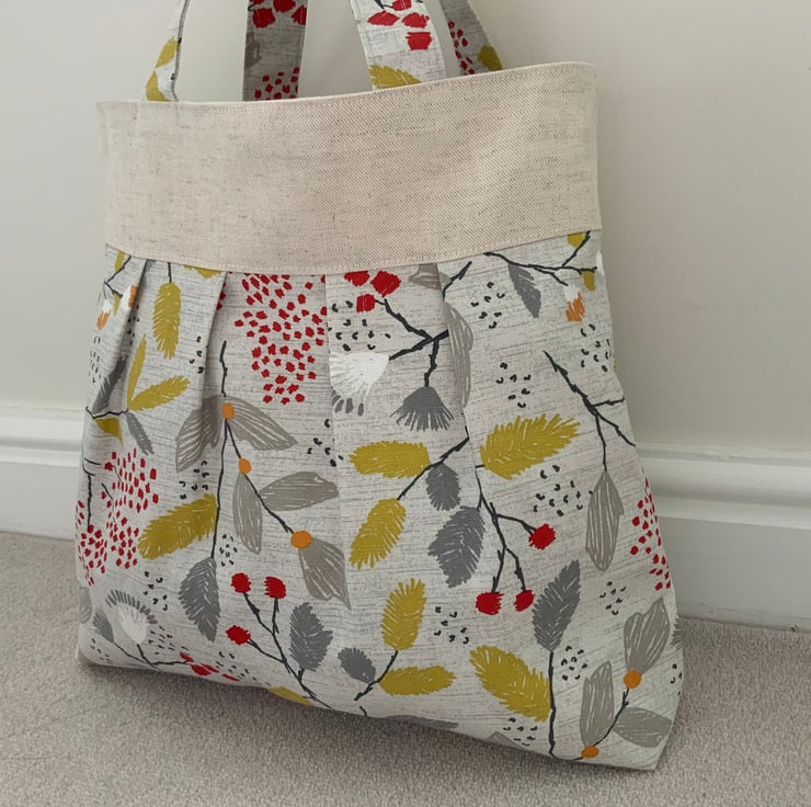 Beautiful Pleated Tote Bag Patterned Fabric Linen Top Handbag Day Bag