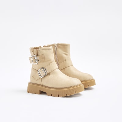 Girls beige buckle biker boots