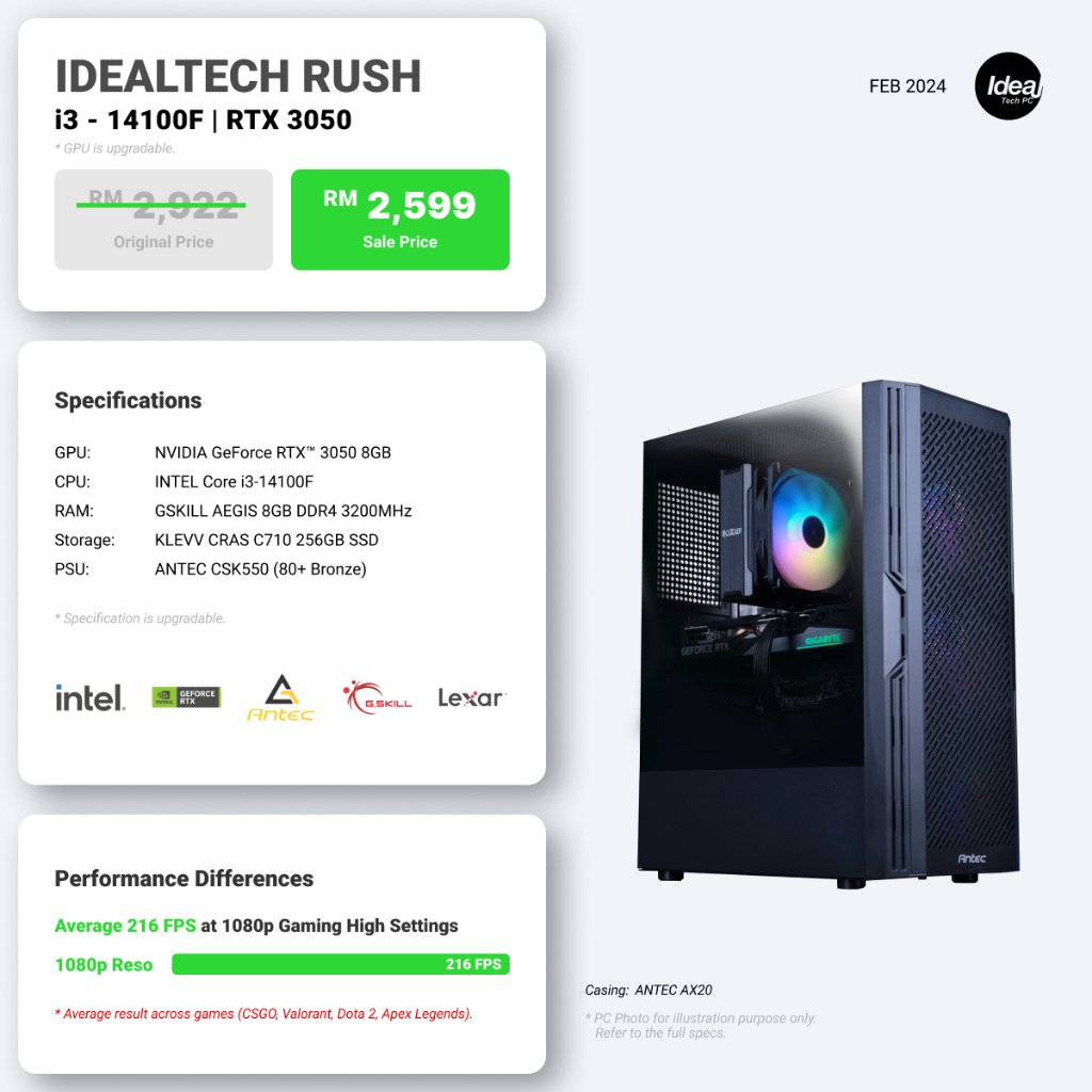 IDEALTECH RUSH Gaming PC Package with NVIDIA RTX3050 8GB INTEL