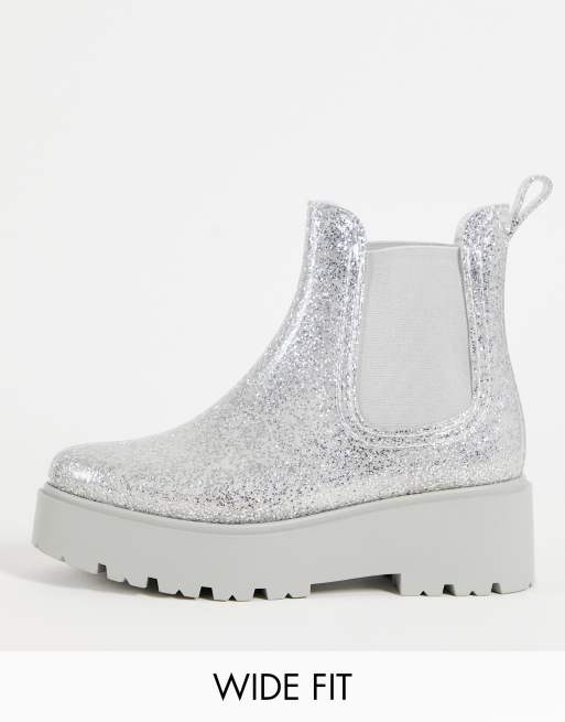 Glitter shop rain boots, ASOS DESIGN Wide Fit Gadget chunky chelsea rain boots in silver shop