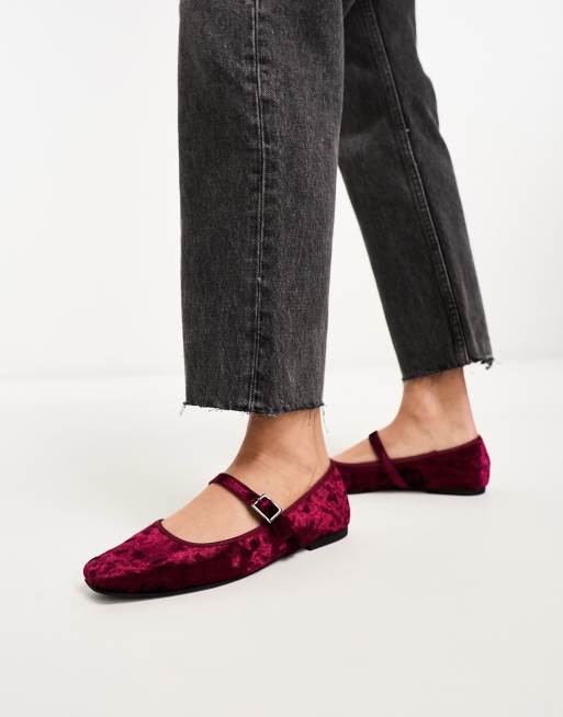 ASOS DESIGN League velvet Mary jane ballet shoes in burgundy