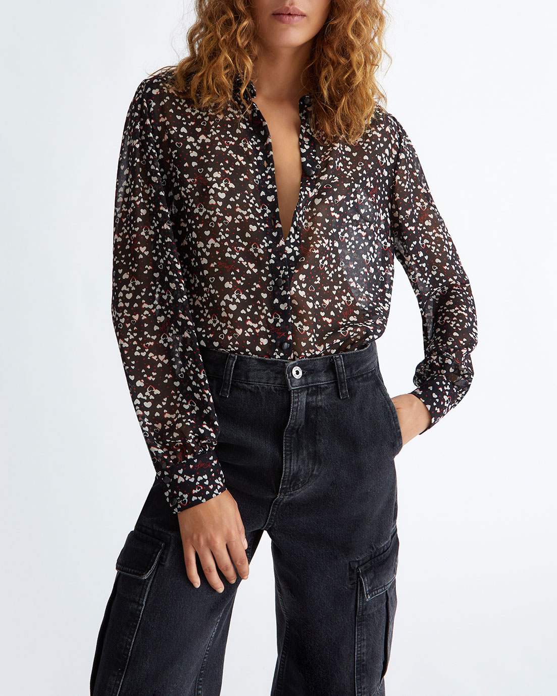 Camicia nera shop e rossa, Camicia nera in georgette a fantasia cuori beige e rossi con shop
