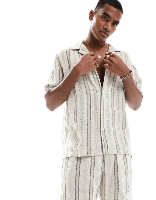Camicia plumetis shop, Abercrombie Fitch Camicia a maniche corte in plumetis misto lino a righe beige e marroni in coordinato shop