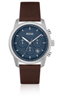 Hugo boss watch blue face leather shop strap, BOSS Analogue Quartz Watch for Men with Brown Leather Strap shop