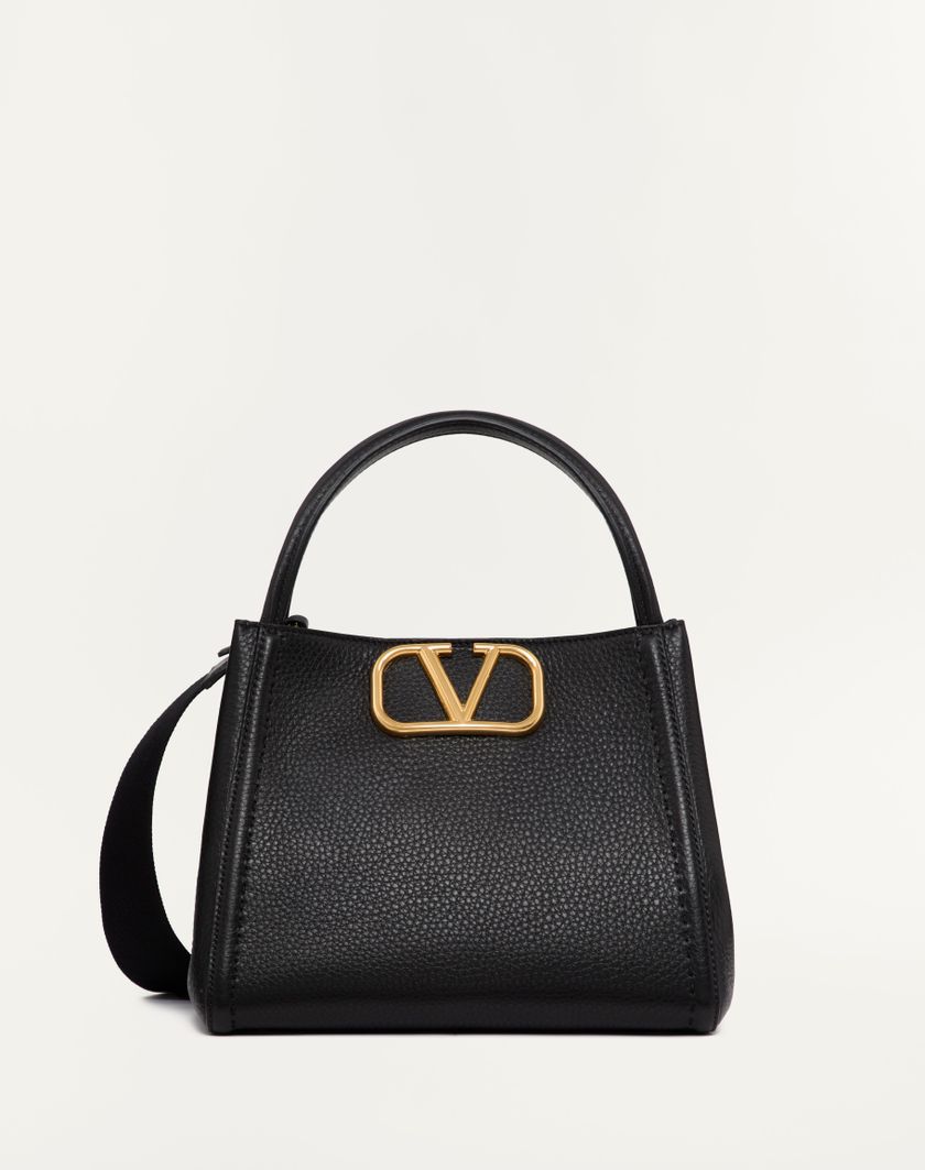 Borsa a mano media Valentino Garavani Alltime in vitello granato con elemento VLogo Signature metallico. La borsa può essere indossata a spalla/cross-body grazie alle tracolle e a mano grazie ai manici in pelle.